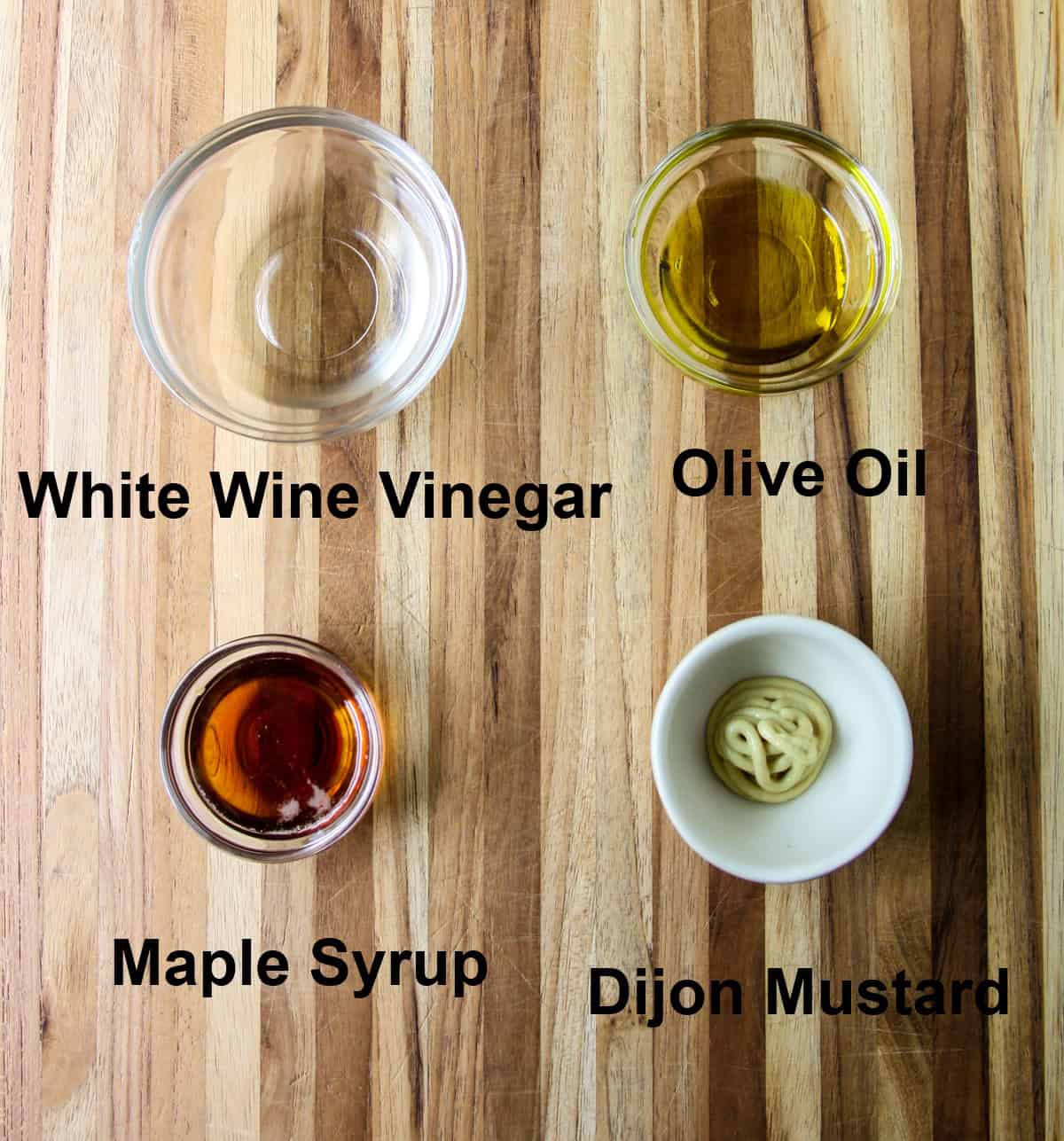 - In a large salad bowl, whisk together the dressing ingredients; maple syrup, olive oil, white wine vinegar and Dijon mustard.