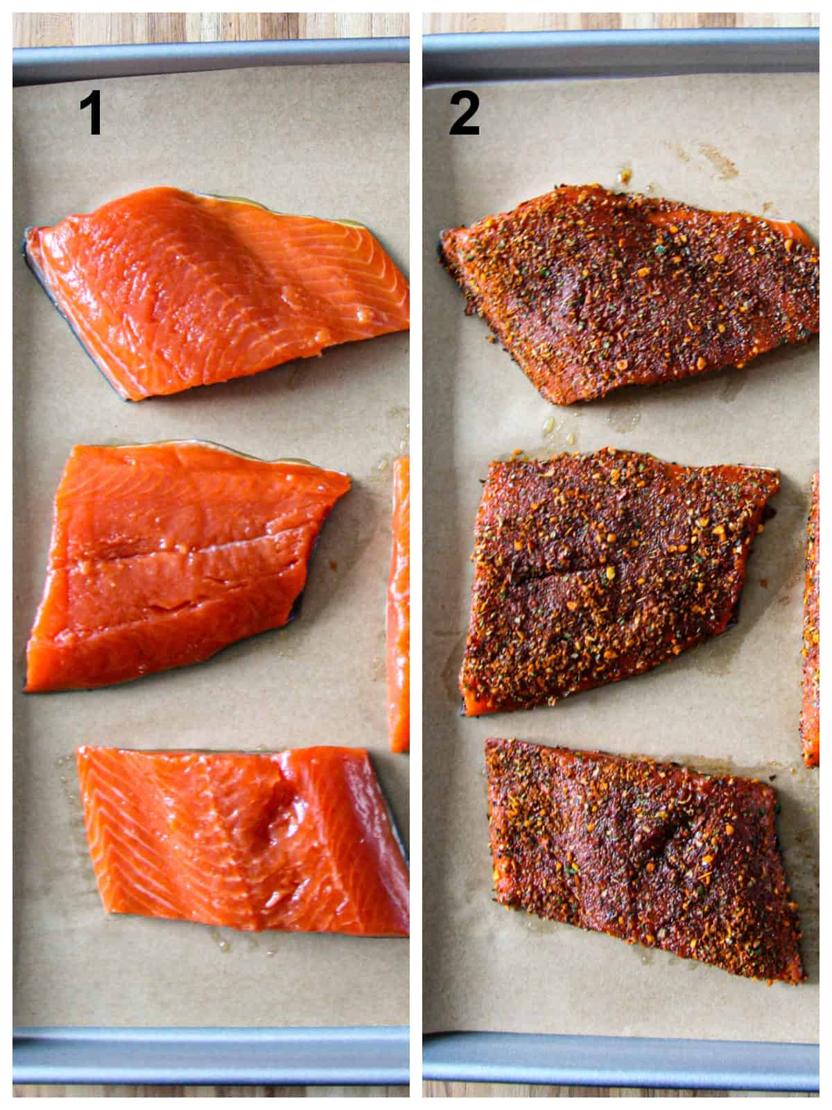 - On a parchment lined baking sheet, place salmon fillets skin side down. Rub the fillets with olive oil to coat.